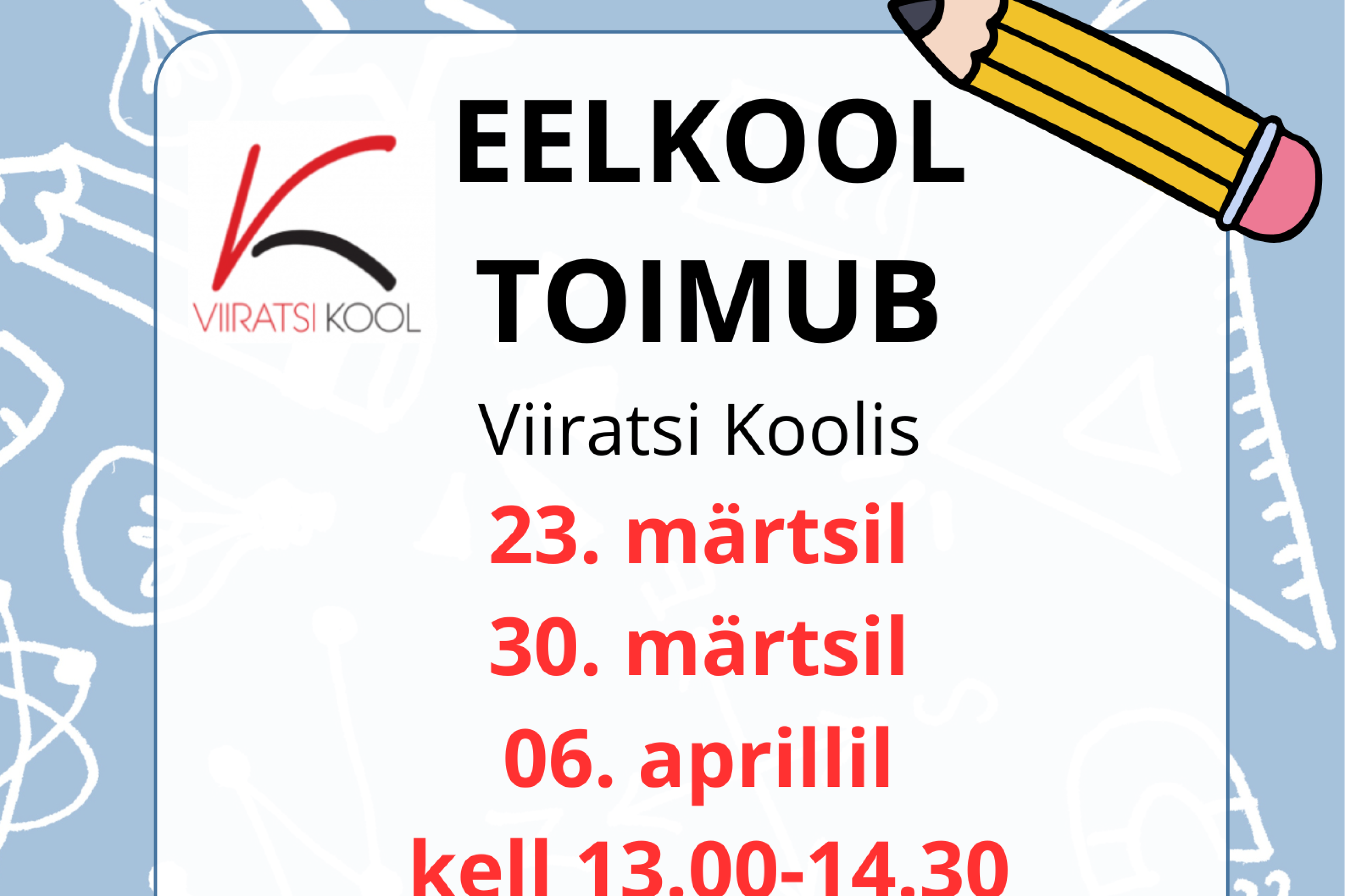 Eelkool 2026. aastal toimub 23. märtsin, 30. märtsil, 6. aprillil kell 13:00-14:30.