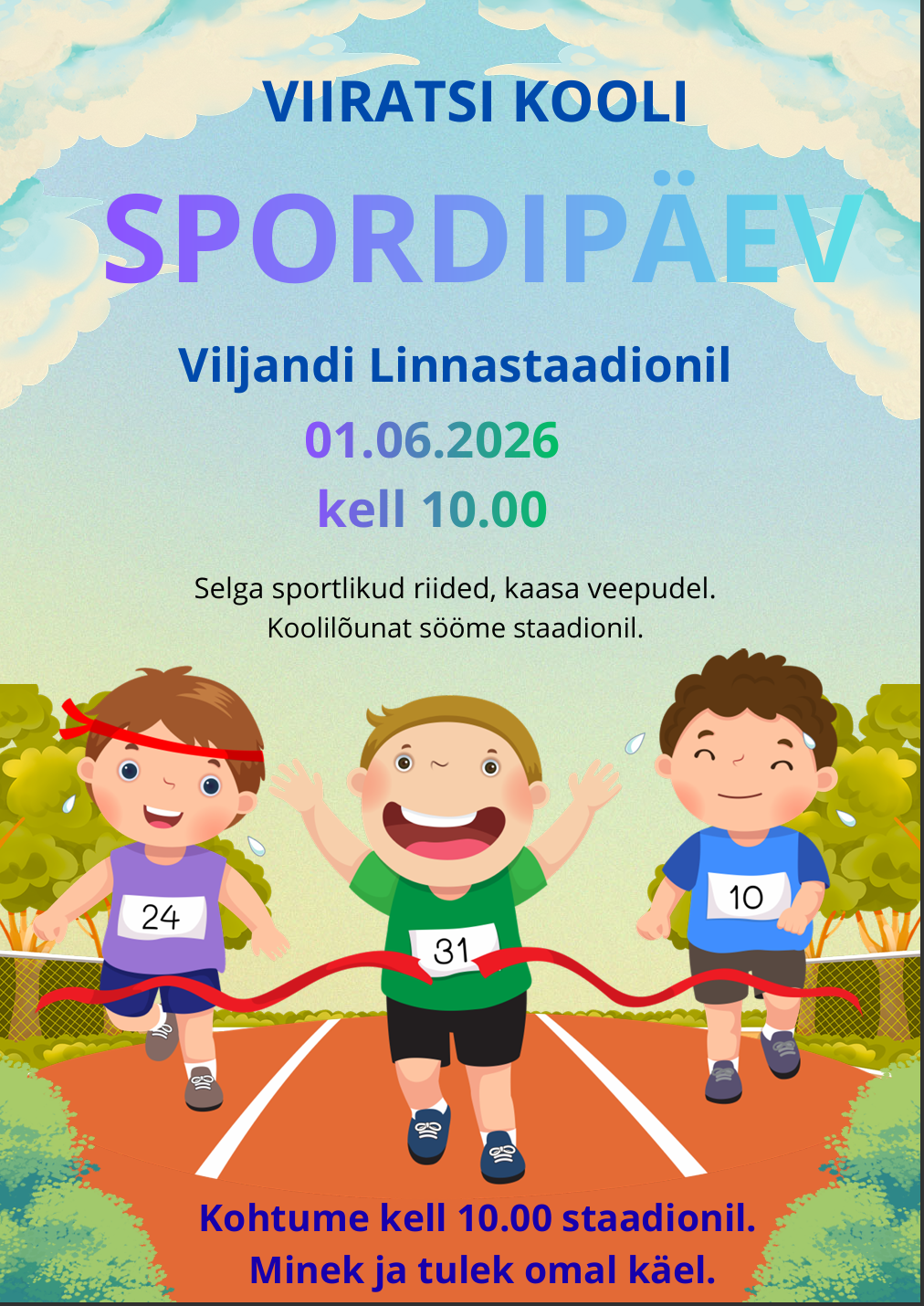 Viiratsi kooli sünnipäev toimub 1. juunil 2026 kell 10:00 Viljandi Linnastaadionil. Selga sportlikud riided, kaasa veepudel. Koolilõunat sööme staadionil. Minek ja tulek omal käel.