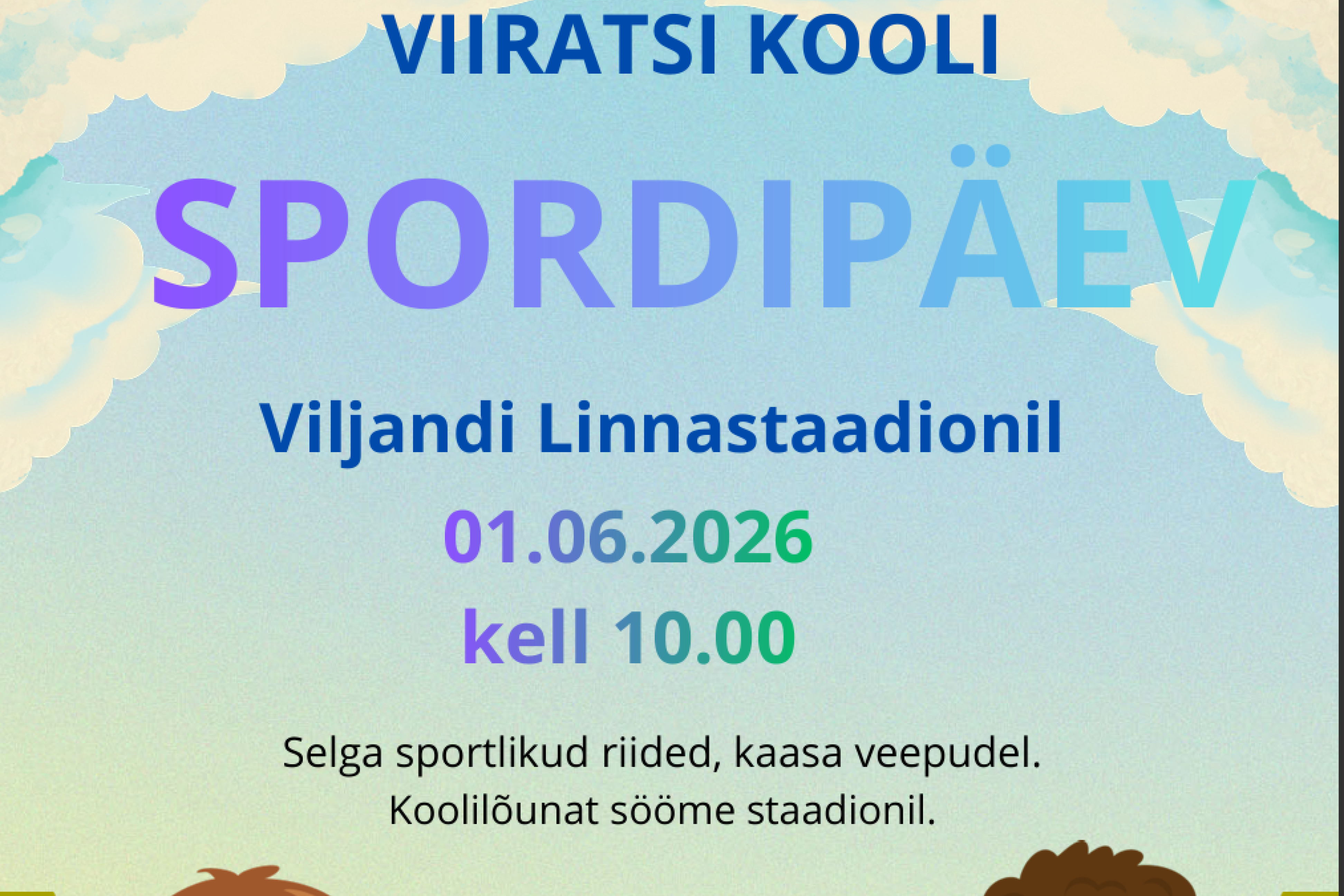 Viiratsi kooli sünnipäev toimub 1. juunil 2026 kell 10:00 Viljandi Linnastaadionil. Selga sportlikud riided, kaasa veepudel. Koolilõunat sööme staadionil. Minek ja tulek omal käel.