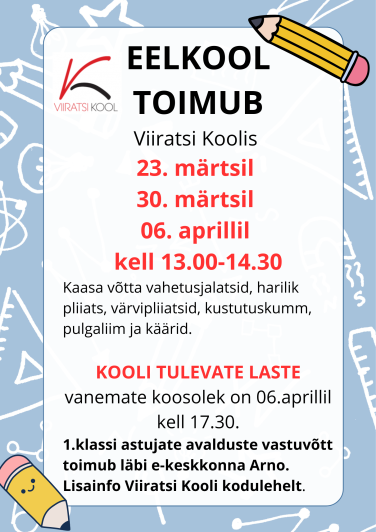 Eelkool 2026. aastal toimub 23. märtsil, 30. märtsil a 6. aprillil kell 13:00-14:30.
