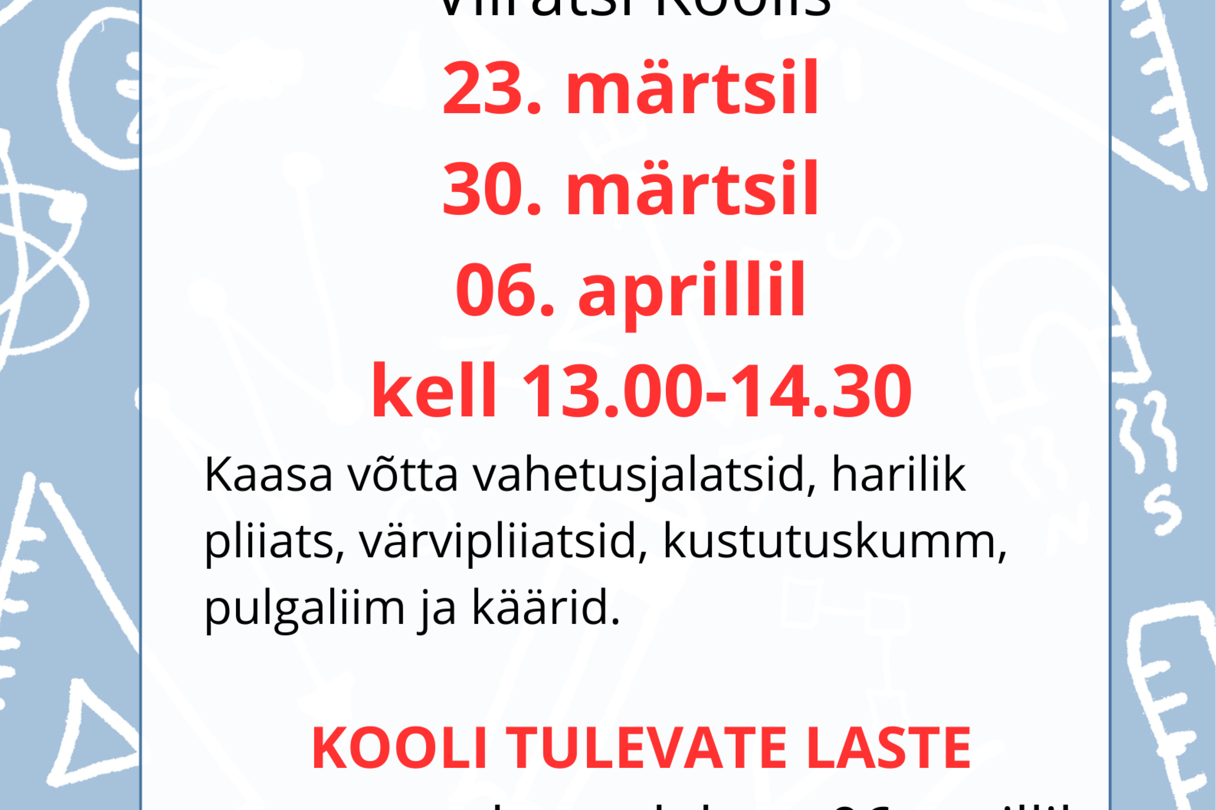 Kooli tulevate laste vanemate koosolek toimub 6. aprillil kell 17:30
